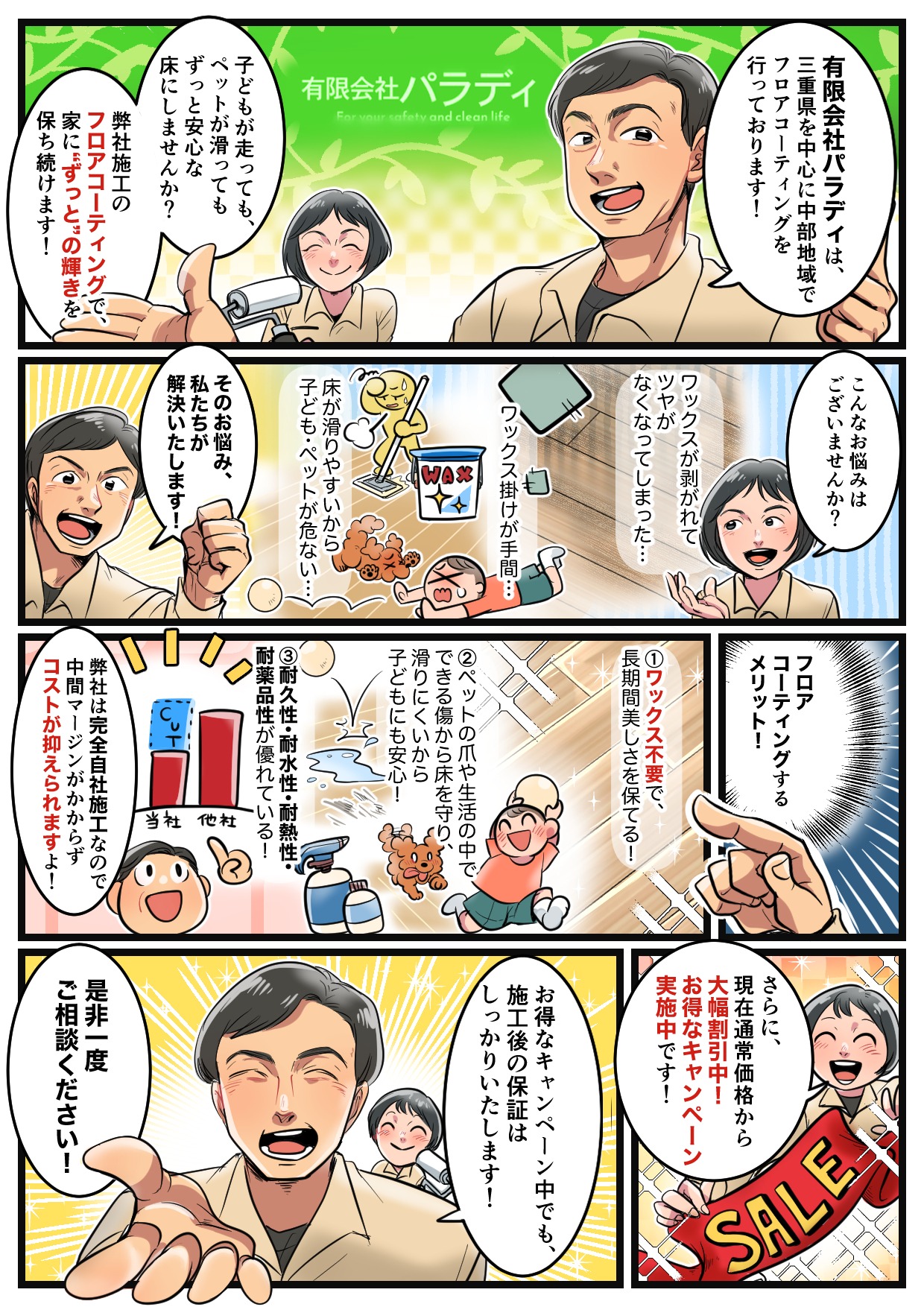 三重県を中心に中部地域でフロアコーティングをおこなっている有限会社パラディです。フロアコーティングをおこなうことで、綺麗な新築の内装を長期間キープすることができます。もちろん現在お住まいのお部屋にも施工することができますので、お気軽にお問い合わせください。